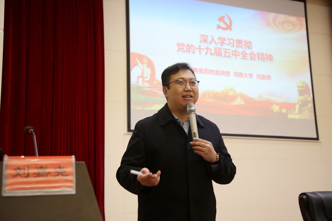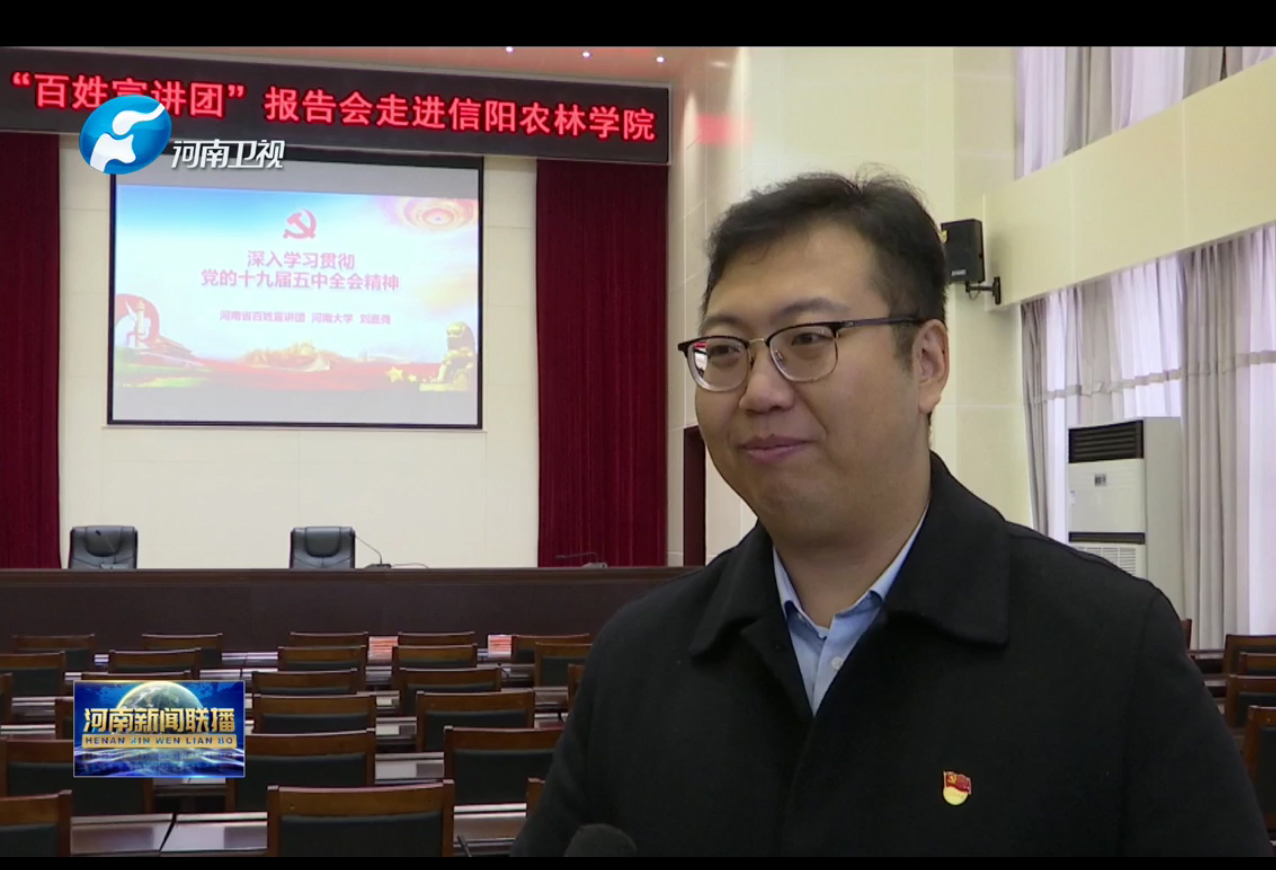 党的十九届五中全会以来,M88官网登录入口M88官网登录入口深入学习贯彻全会精神,开展了形式多样的宣讲活动。学院教师刘嘉尧代表省委百姓宣讲团先后在信阳师范学院、信阳农林学院、M88官网登录入口等高校为青年学子宣讲十九届五中全会精神。河南电视台新闻联播分别于11月30日、12月1日进行了报道。12月7日,中央电视台新闻联播也对宣讲活动进行了播报。